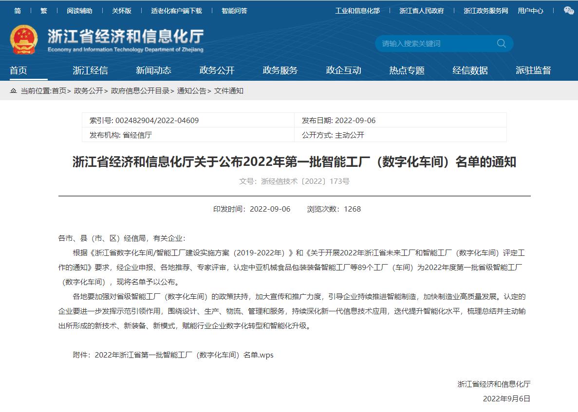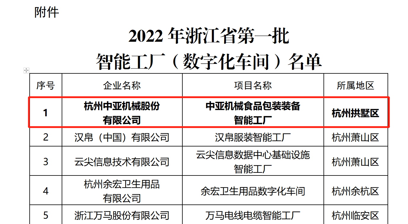 根据《关于开展2022年浙江省未来工厂和智能工厂(数字化车间)评定工作的通知》要求,经公司申报、各地推荐、专家评审,中亚机械食品包装装备智能工厂被认定为2022年度第一批省级智能工厂。
