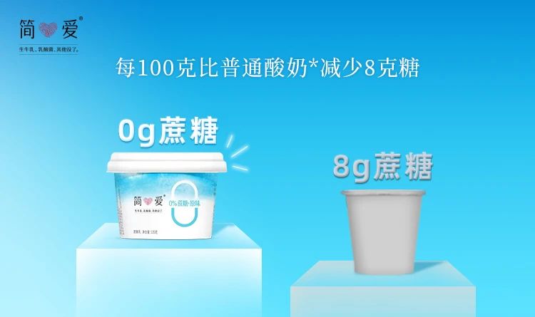 据悉,简爱酸奶0蔗糖系列,每100g比普通酸奶减少8g糖,同时营养成分更丰富:4.0g/100g的蛋白质含量,远高于国际标准的2.9g/100g,还有114mg/100g的天然乳钙,营养价值高。